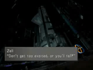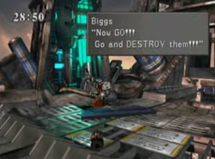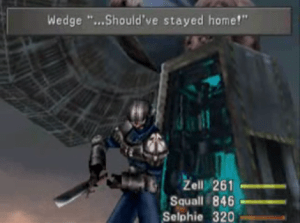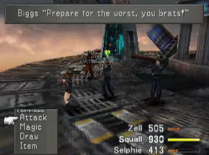 Biggs realizes the threat that Zell poses to his life and decides to take him out first, but Zell shrugs off the attacks. After one round, Wedge shows up. Biggs chews him out for allowing enemies to get near and Wedge gets his feelings hurt.