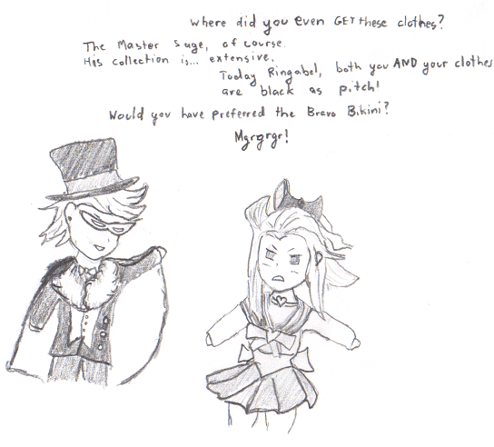 It’s very cold and snowy and I was bored so I doodled Ringabel and Edea as Sailor Moon and Tuxedo Mask in my yearly act of fandom. I honestly could see similar costumes appearing in this game, which has a worrisome preoccupation with the characters playing dress-up.